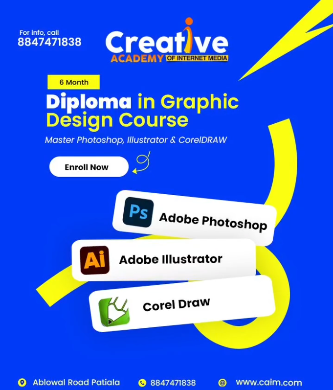 Our Graphic Designing course in Patiala is the best place to start if you wish to work in a creative field. Students learn the skills they need for the design business by getting hands-on experience using Adobe Photoshop, Adobe Illustrator, CorelDRAW, and Canva. The Creative Academy of Internet Media teaches students how to learn by doing, establish a portfolio, and design professionally. Today is the day to start your journey to become a professional graphic designer.